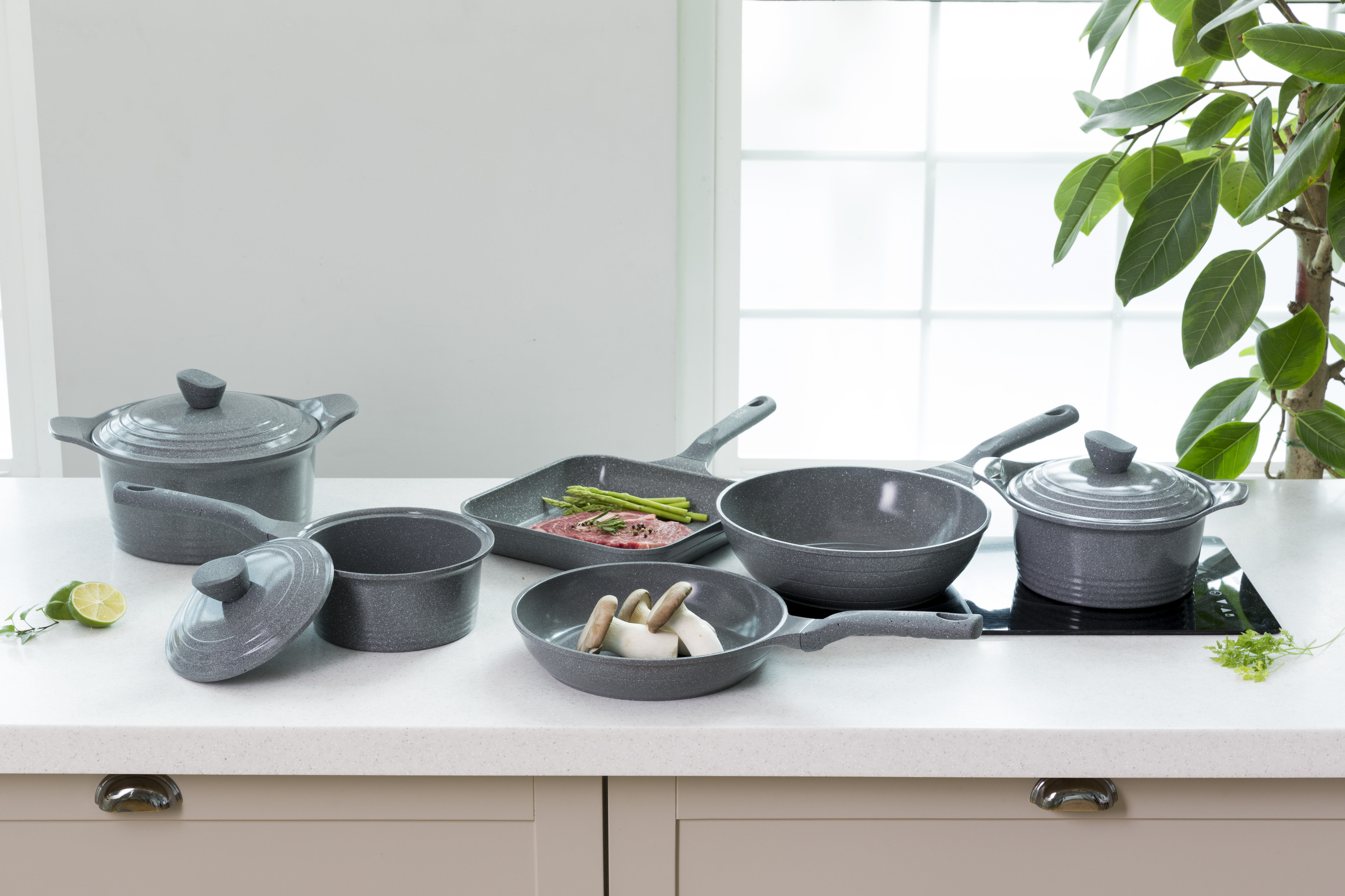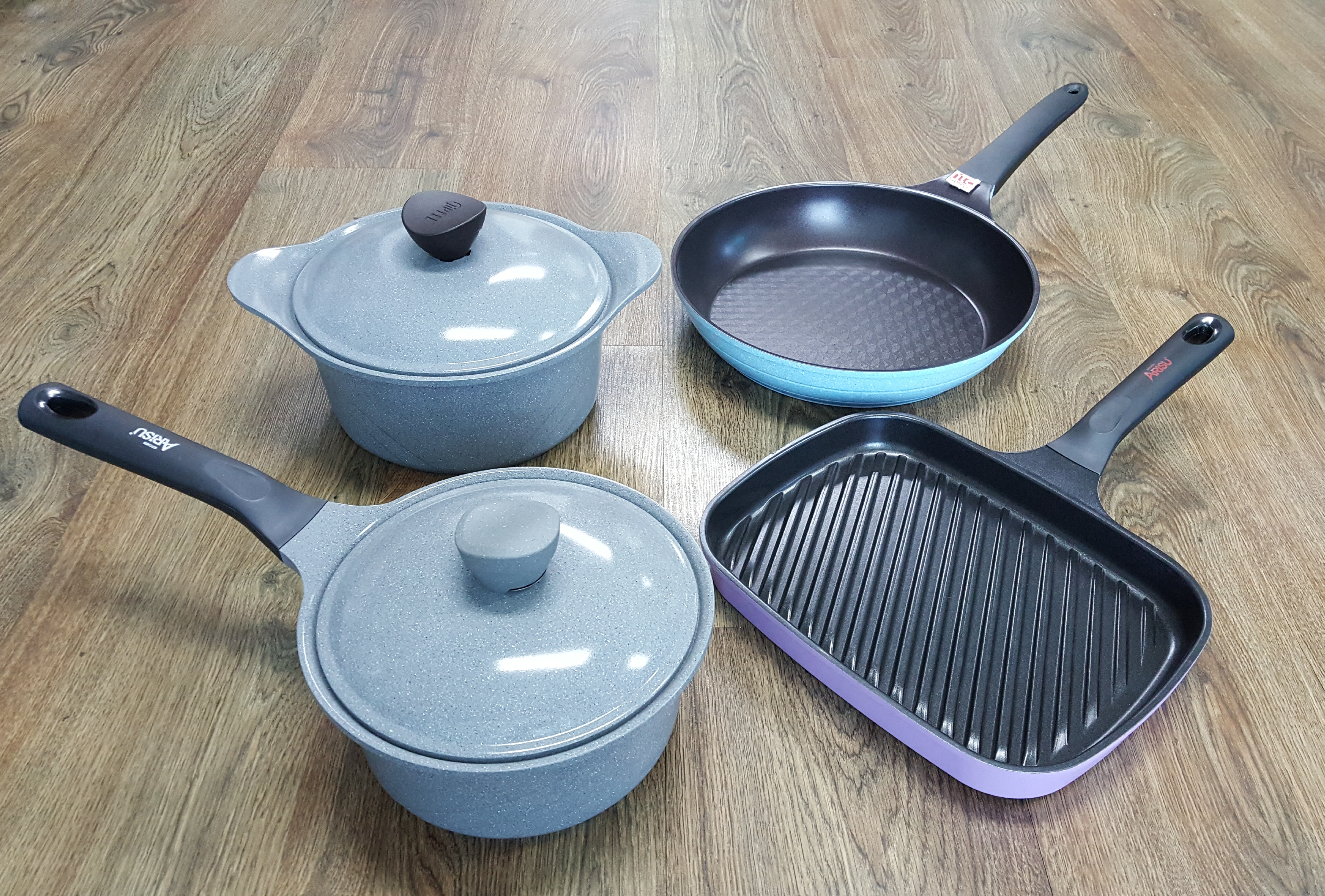 Aluminum Titanium stone coating set (Frying pan, wok, pot, grill pan, Tempered glass cover)